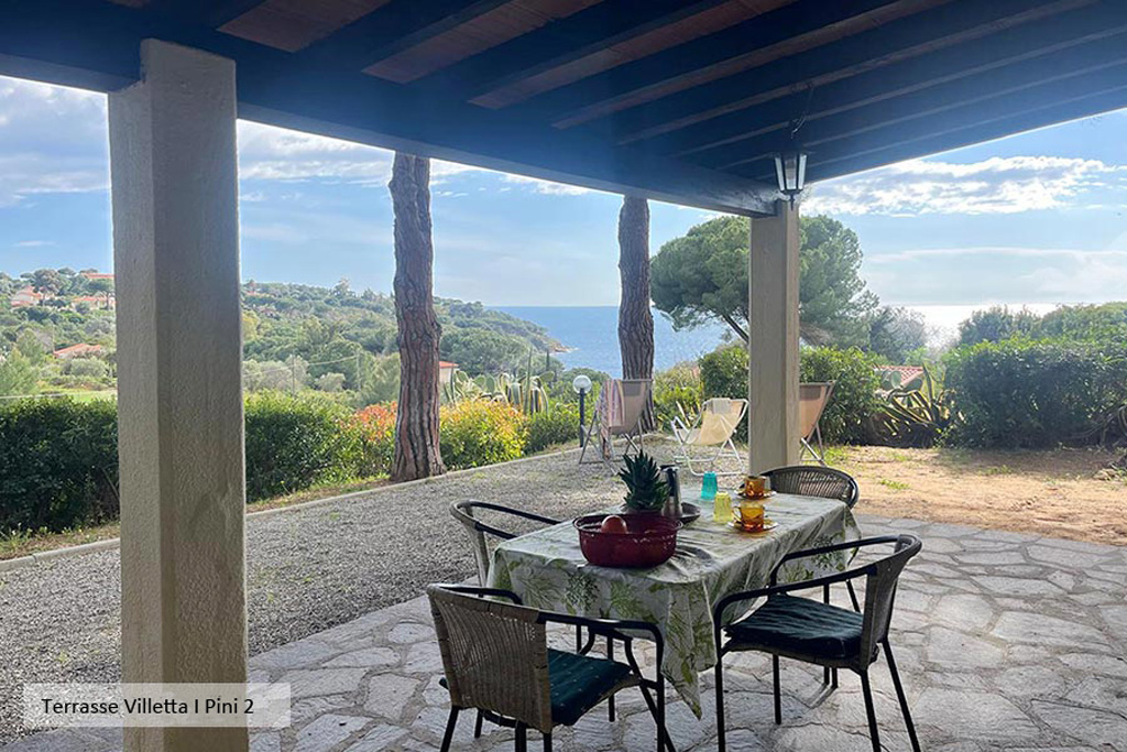 Das Ferienhaus beherbergt zwei nebeneinanderliegende Ferienwohnungen, beide haben eine Sonnenterrasse mit Blick auf das azurblaue Meer. Die Ferienwohnungen sind schlicht und einfach gestaltet, in jeder Wohnung gibt es ein Doppelzimmer und ein Zweibettzimmer, einen Wohnbereich mit Schlafcouch sowie Küchenbereich und ein Duschbad. Die Ferienwohnungen haben separate Zugänge. Der Eingang der Wohnung I Pini 2 führt über die offene Veranda in die Wohnung, die Wohnung I Pini 1 hat zwei Zugänge, einen über die Terrasse, einen zweiten über das seitliche Zweibettzimmer. Die Terrasse der Wohnung I Pini 1 wurde überdacht und hat jetzt einen offenem Zugang und schönen Meerblick.