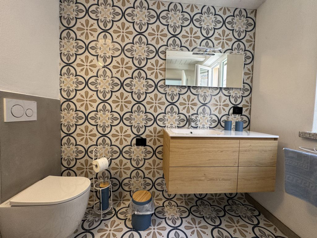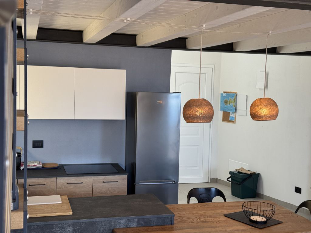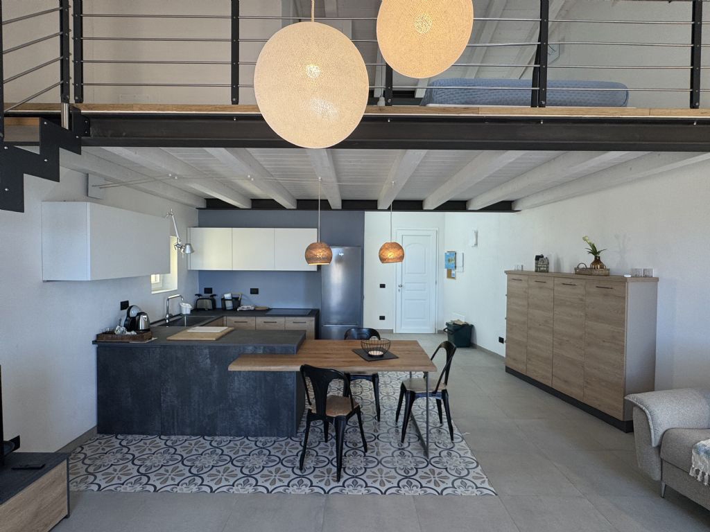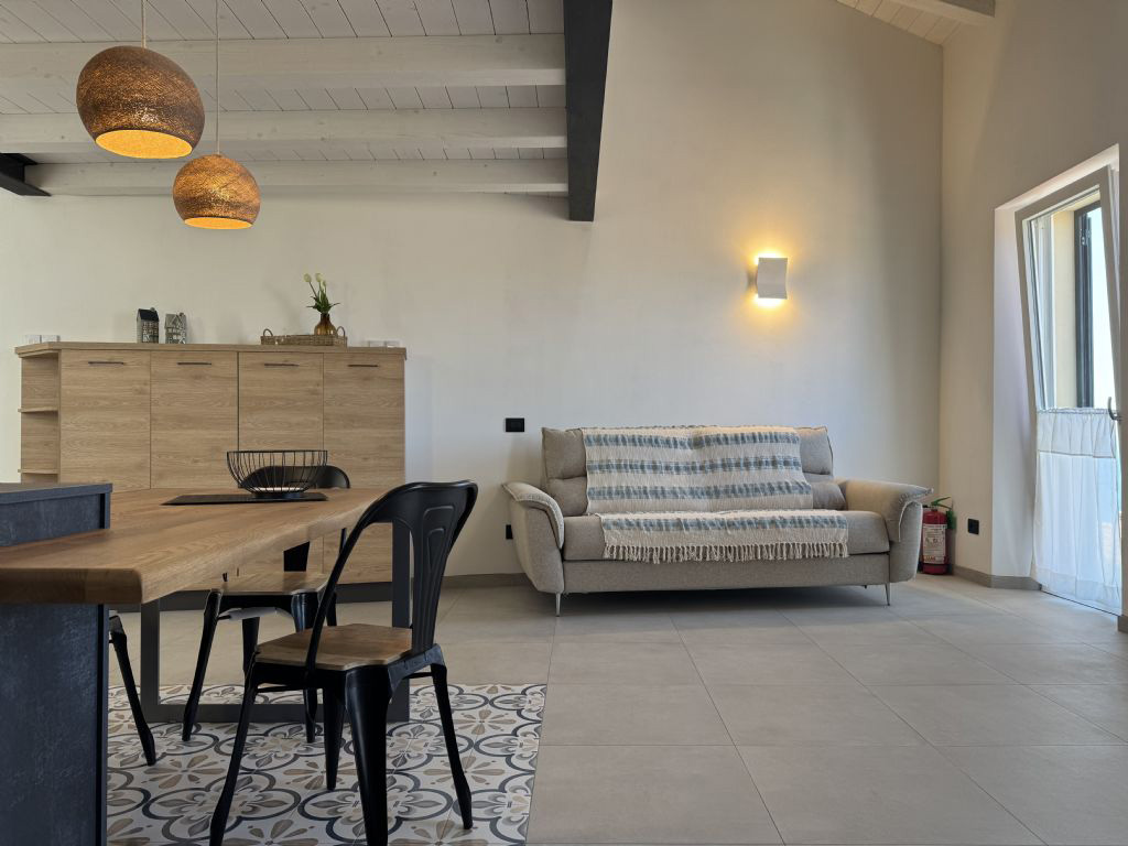 Die wunderschöne, ganz neue Ferienwohnung ist geschmackvoll und gemütlich eingerichtet mit schönen Leuchten und Dekorationsdetails ausgestattet. Der Eingang im Parterre führt direkt in den hellen Open-Space Wohn- und Küchenbereich mit direktem Terrassenzugang. Durch die Hanglage der Wohnung ist der Eingang ebenerdig und die Terrasse auf der ersten Etage.